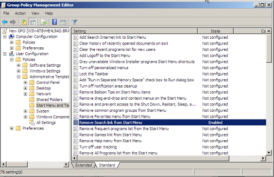 A GPO is created and a Start Menu setting is configured, which is shown in Figure 4. All Start Menu settings are located under the User Configuration node in the GPO editor, so only user accounts will receive these settings. The GPO is linked to the HR OU.