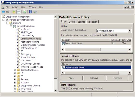 Figure 2: Security Filtering interface and configuration for a GPO using the GPMC.