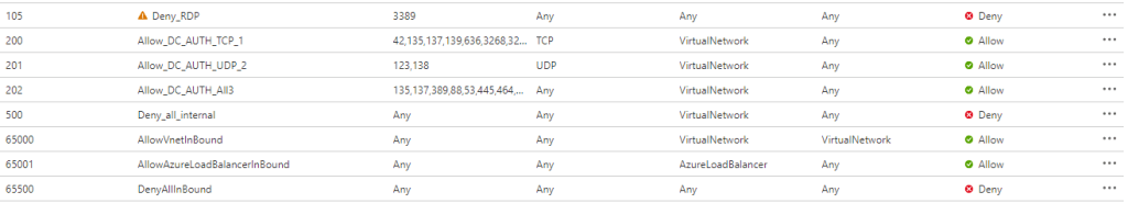 This NSG config will leave the server not contactable as you can see we block RDP in rule 105