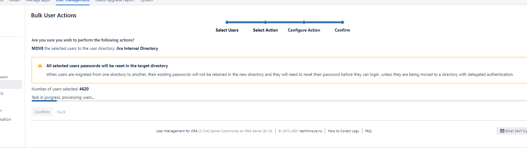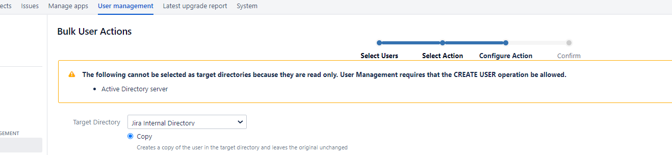 - If you use AD SYNC . and for any reason you need to get in the server for any reason after the migration , beware this guidance migrates all users from AD to Jira Directory. Doing so you will need a Jira Admin account not synced to ad . if any AD user has to get in the old enviorment. You must reset the password as is lost in the process.
