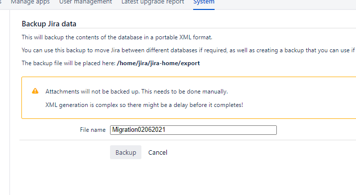 - Connect Via SSH to the server and head to the folder: /home/jira/jira-home/export