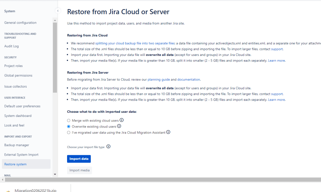 We will select “Import data” , and Merge users ( that’s why we used before Jira cloud assistant! ). And then select the ZIP .