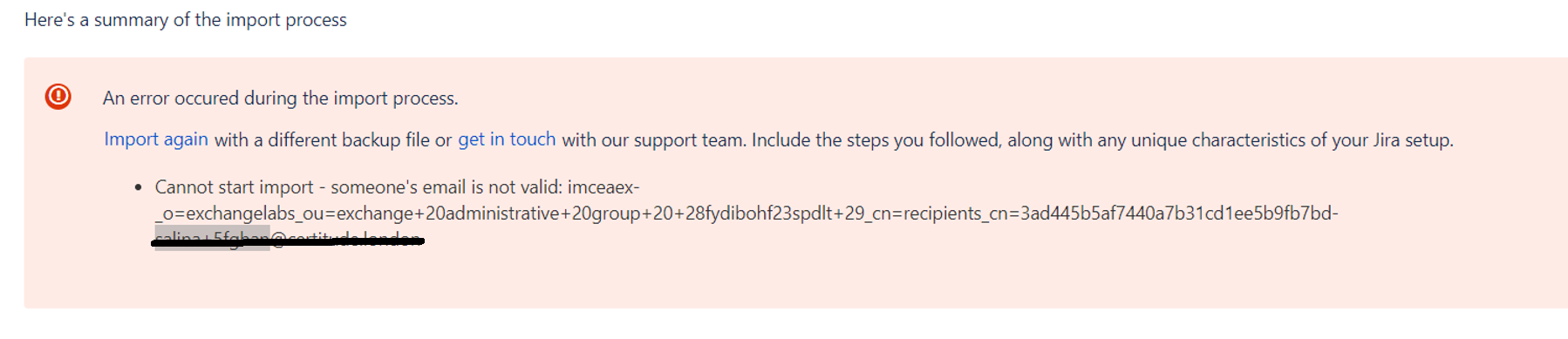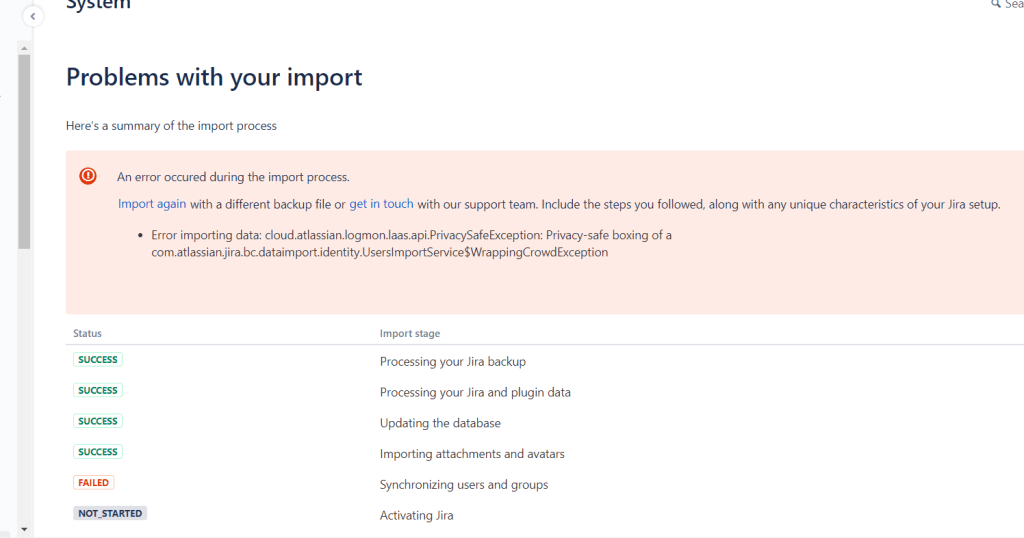 ** Import again with a different backup file or get in touch with our support team …. Include the steps you followed , along with any unique characteristics of your jira Setup **