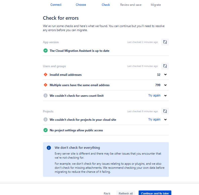 - Strategy Recommended : We will use Cloud migration assistant to check for possible errors in our Jira directory – AD Sync. Migrate the users once all errors are cleared. Further in the guidance you’ll notice we will migrate with the site export. but we will “merge” the users after that . If you do not resolve invalid emails or duplicates… with the assistant you will have to do so during the site import/export. If not done the migration wont continue. So as recommendation and good practice we do this before the process of “Site / import export”