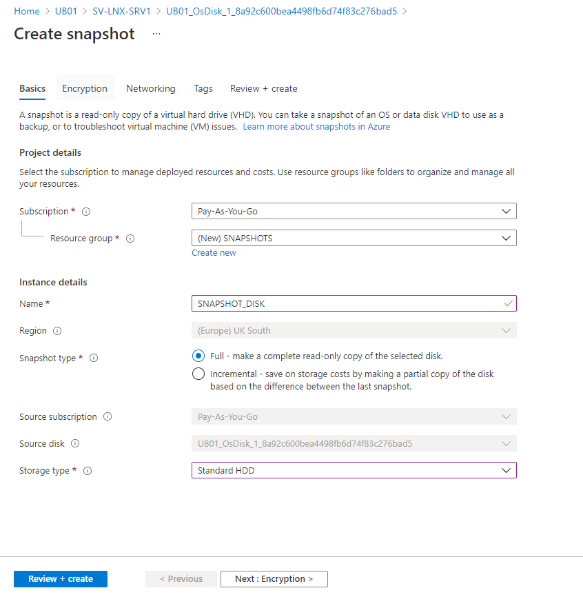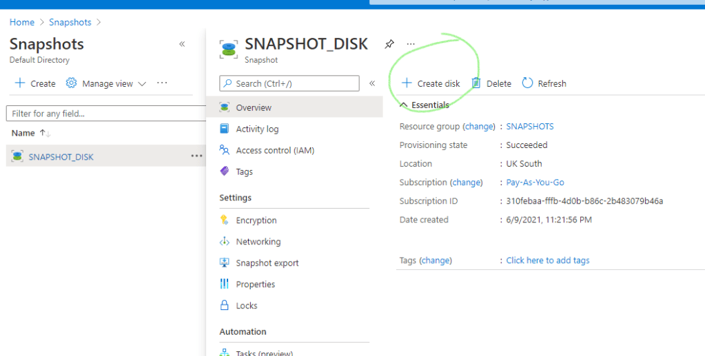 Now . We are going to create a separate resource group for snapshots ( as good practice ) , and snapshoot the VM DISK . Please do not ignore the snapshoot part!