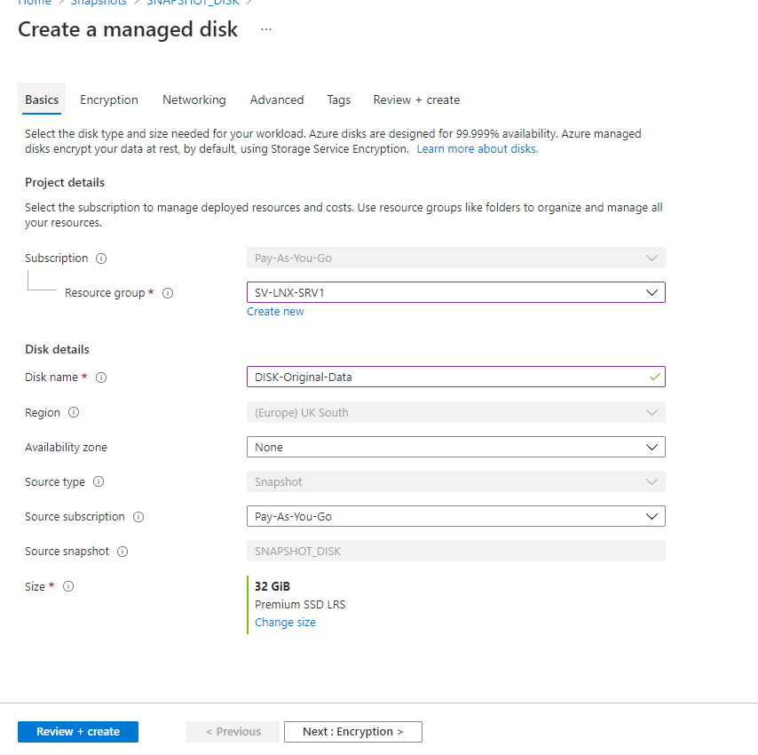 Now . We are going to create a separate resource group for snapshots ( as good practice ) , and snapshoot the VM DISK . Please do not ignore the snapshoot part!