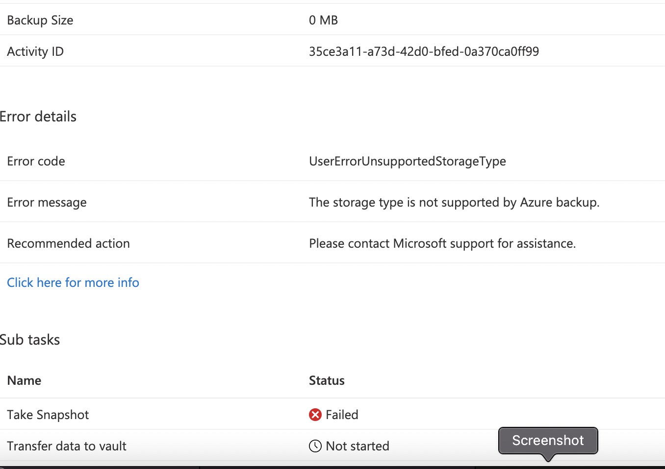 This error is commonly associated when you try to backup an unsupported storage as for exammple zone redundant storage.