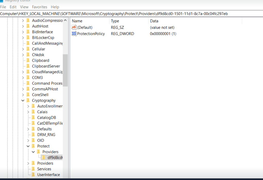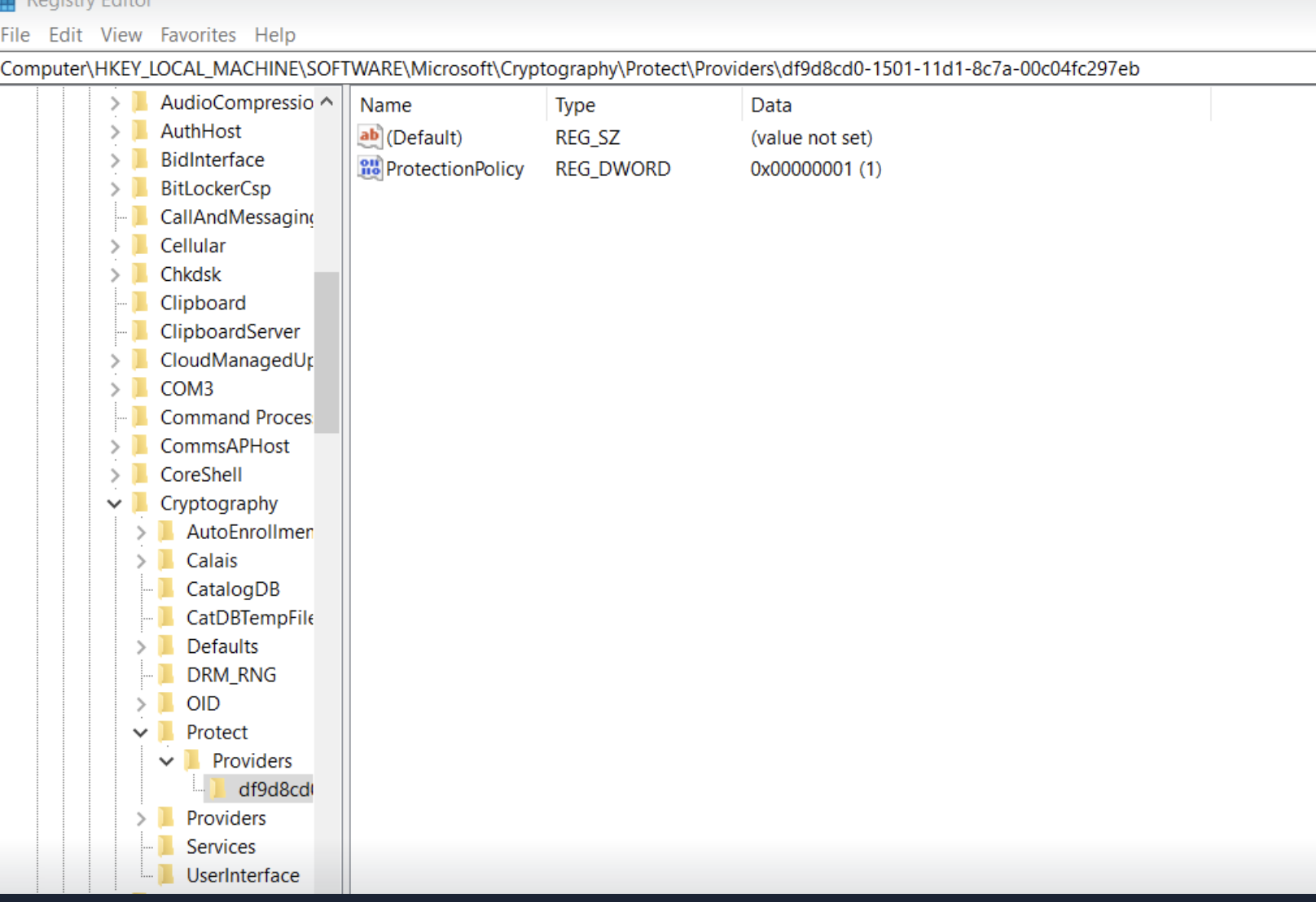 HKEY_LOCAL_MACHINE\Software\Microsoft\Cryptography\Protect\Providers\df9d8cd0-1501-11d1-8c7a-00c04fc297eb