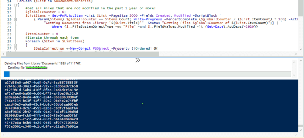 Write-Progress -PercentComplete ($ItemCounter / ($ListItems.Count) * 100) -Activity "Deleting Files from Library '$($List.Title)' $ItemCounter of $($ListItems.Count)" -Status "Deleting file '$($Item['FileLeafRef'])"