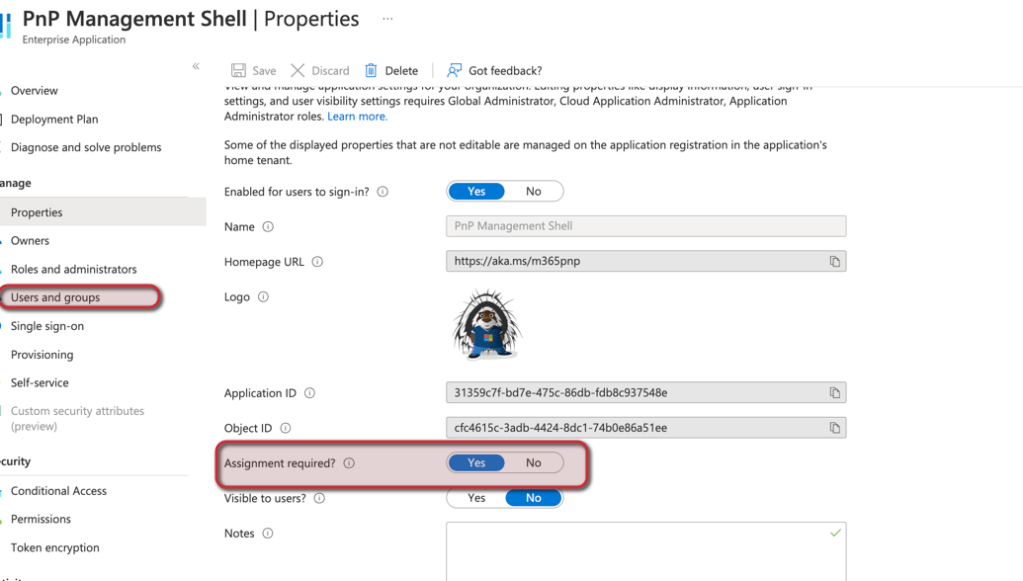 - Ensure “Assignment is required “to only the users/admins that are to use PNP