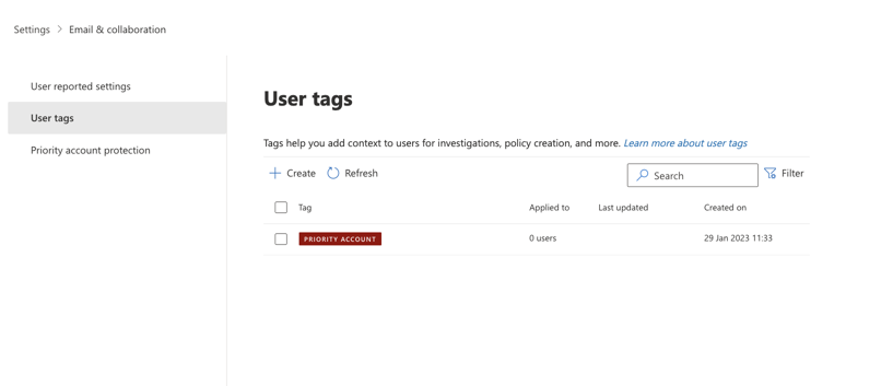 - Additional visibility in reporting: In effect, information for all users (or all affected users) is already available in alerts, reports, and investigations. The priority accounts tag as a filter allows you to specifically target your investigations.