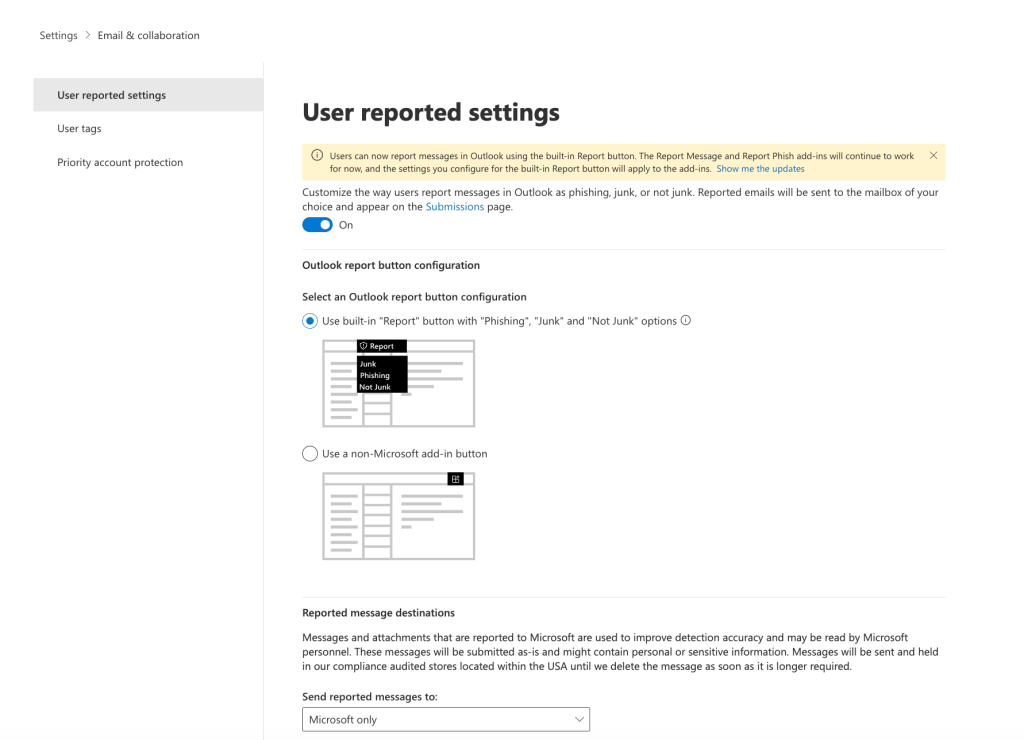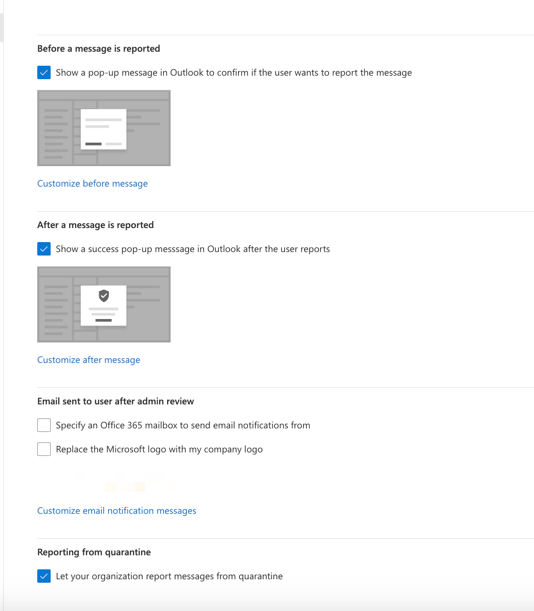 - Enable for users reporting in outlook messages that could be phish of spam and customize several options on the reporting