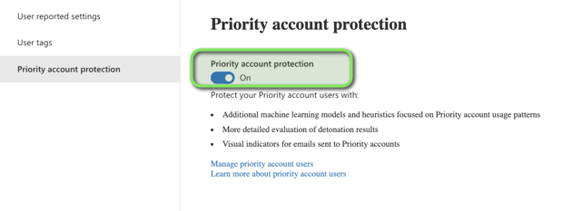 - Additional heuristics: Our analysis of mail flow in the Microsoft datacenters indicates that mail flow patterns for company executives are different from the average employee. Priority account protection offers additional heuristics that are specifically tailored to company executives that wouldn’t benefit a regular employee.