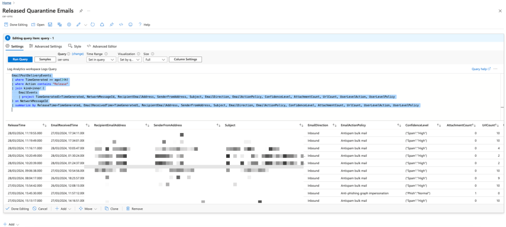In essence, the dashboard provides a 24-hour generic view of released emails for quick review and can be used and pinned in Sentinel alerts. Its creation in Azure and setting appropriate permissions enable detailed analysis for enhancing security monitoring and response.
